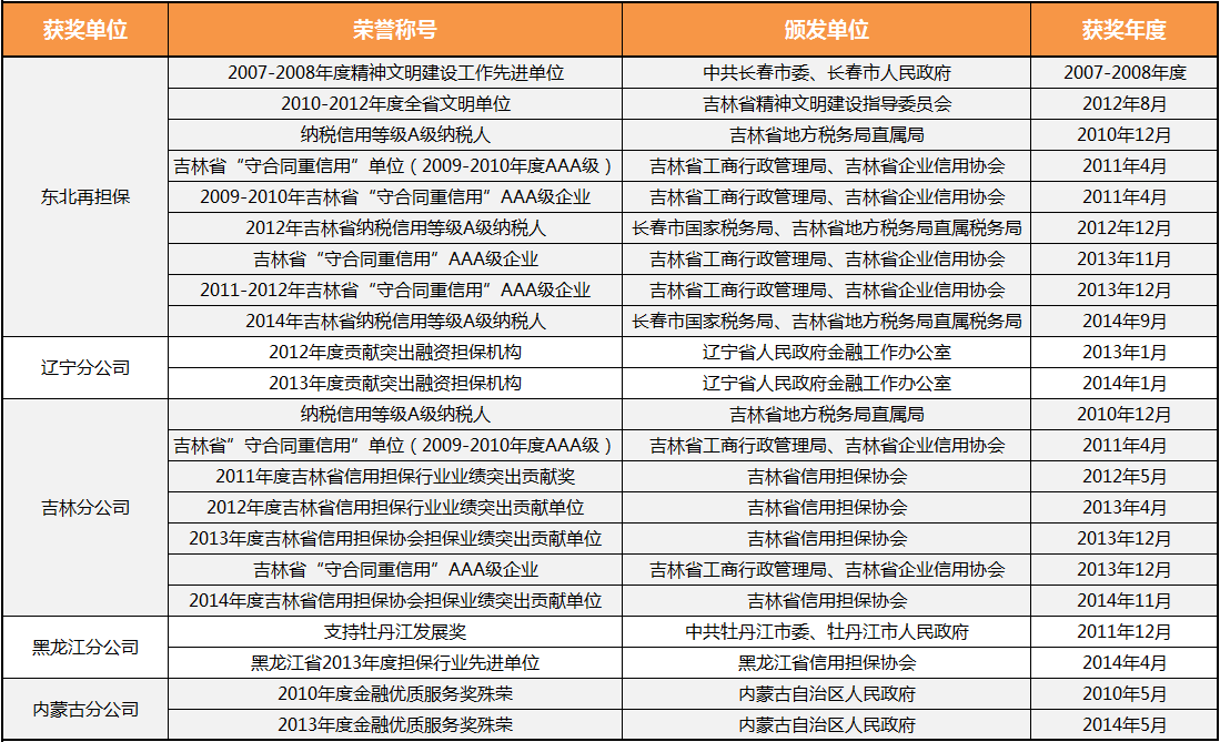 公司成立以来,紧紧围绕促进东北区域中小企业担保体系和信用体系建设,全力提供各类担保、再担保服务。充分发挥再担保机构增信、分险等作用,积极推进东北再担保运营体系建设,累计纳入体系担保机构100余家;坚持“风险共担”和“不存保证金”等原则,全面推进与银行合作,已与50余家银行总行及省级分行等签署战略合作协议;已累计为12000余户企业提供融资服务。大公国际资信评估有限公司、联合资信评估有限公司、东方金诚国际信用评估有限公司、中诚信国际信用评级有限责任公司、鹏元资信评估有限公司等评级机构评定公司主体信用级别为AA+。